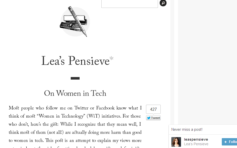 A bit of a rant but Lea’s post from mid-2013 is well written and provides a different viewpoint than we usually hear from women in STEM. Worth sharing, I think…